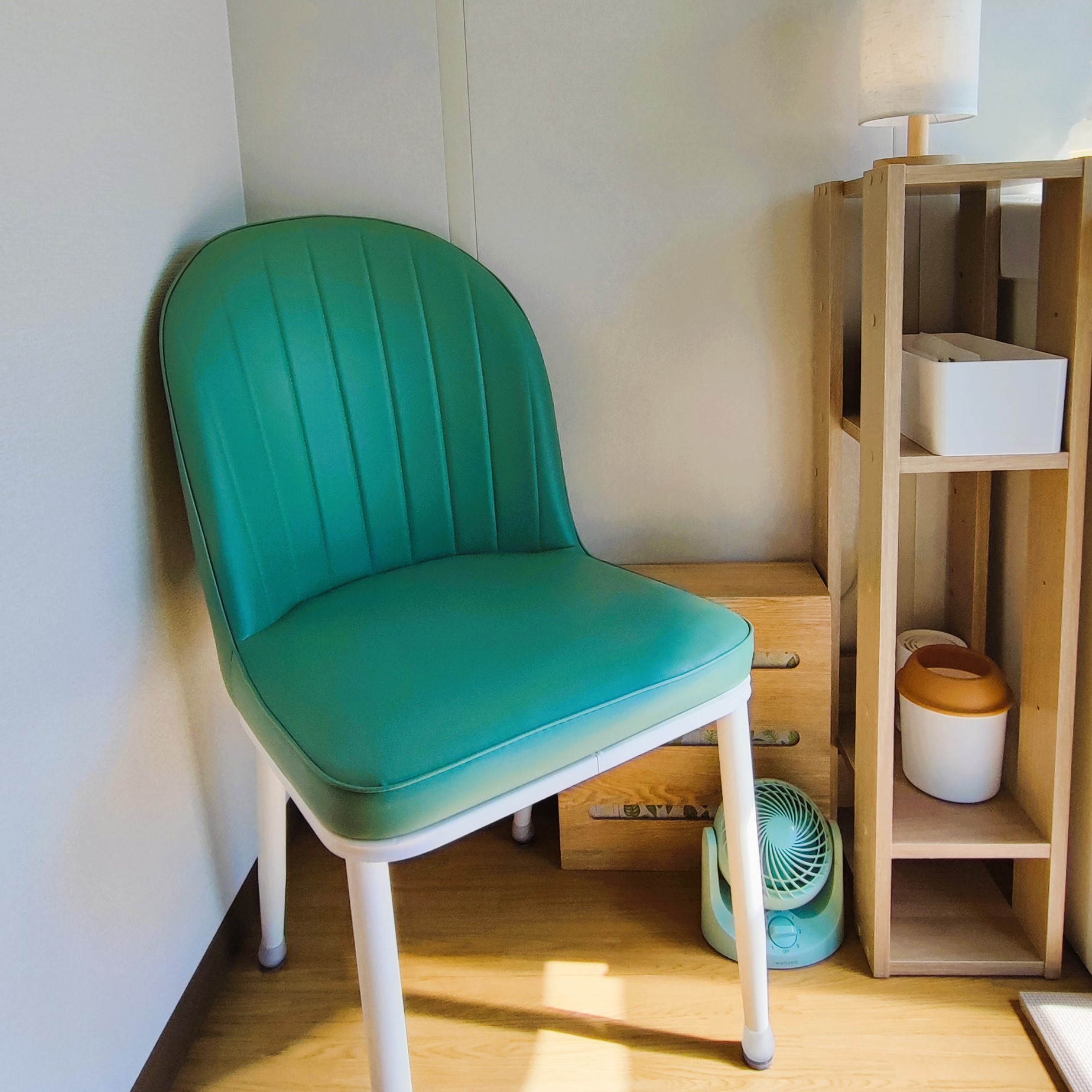 のんびりとお待ち頂けるように、背もたれのある椅子を設置しました。足元には季節に合わせてサーキュレーターや加湿器を配置しております。