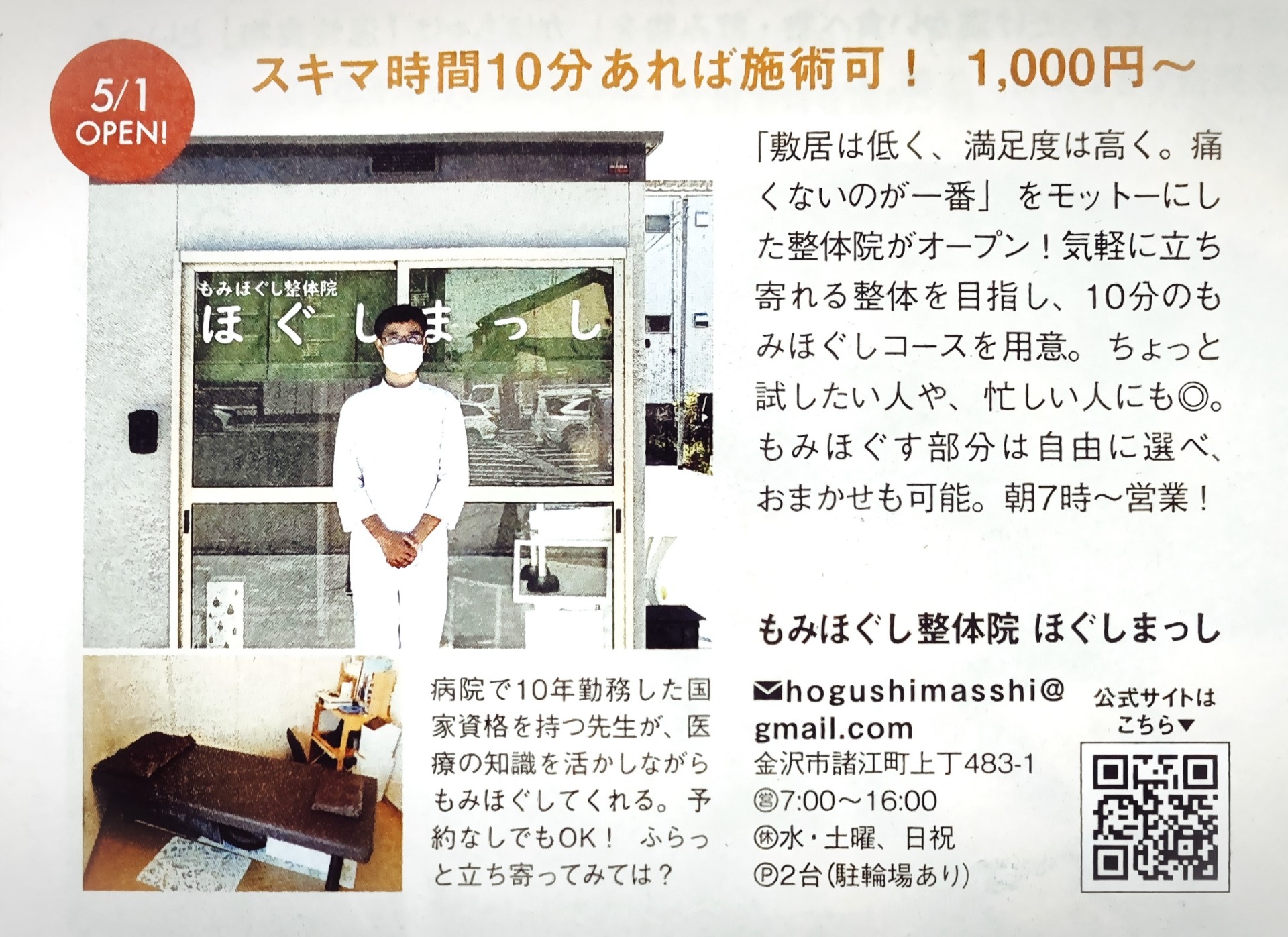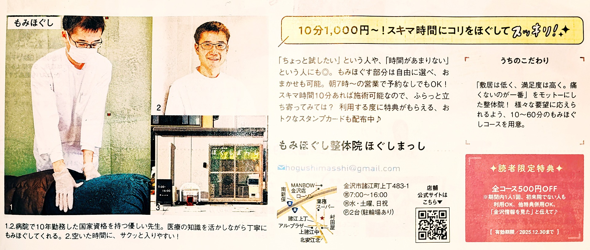当院は10分のもみほぐしコースがございます。ちょっとお試ししたい方や、お忙しい方にも来院しやすいようになっております。