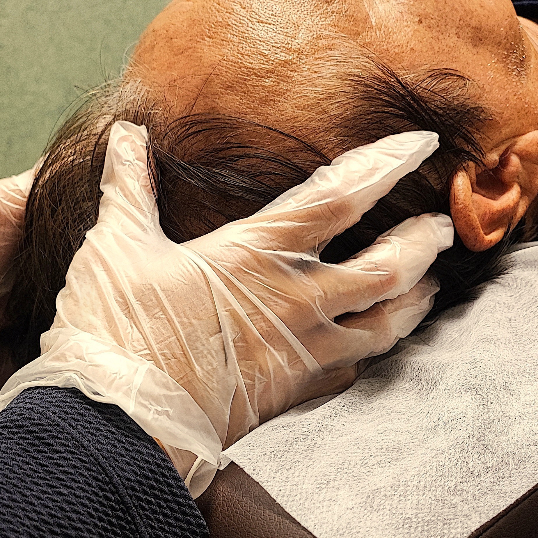 【頭のもみほぐし】こめかみ部分(側頭筋)をほぐしている画像です。眼精疲労が原因で緊張性頭痛が起こりやすくなっている方にオススメです。