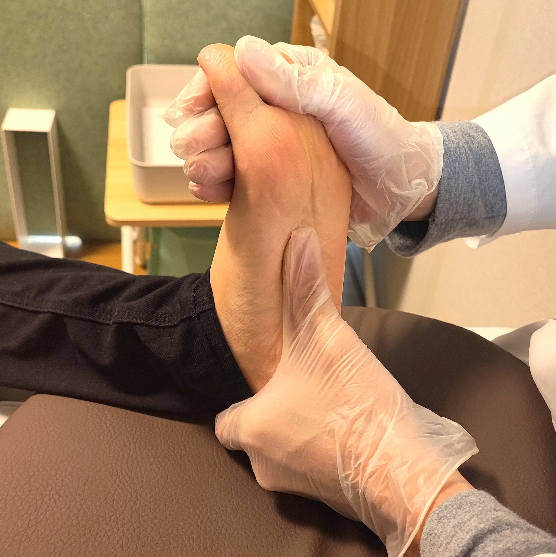 【足裏のもみほぐし】足の土踏まず部分(短母趾屈筋)をほぐしている画像です。立ったままでいる事が多い方にオススメです。